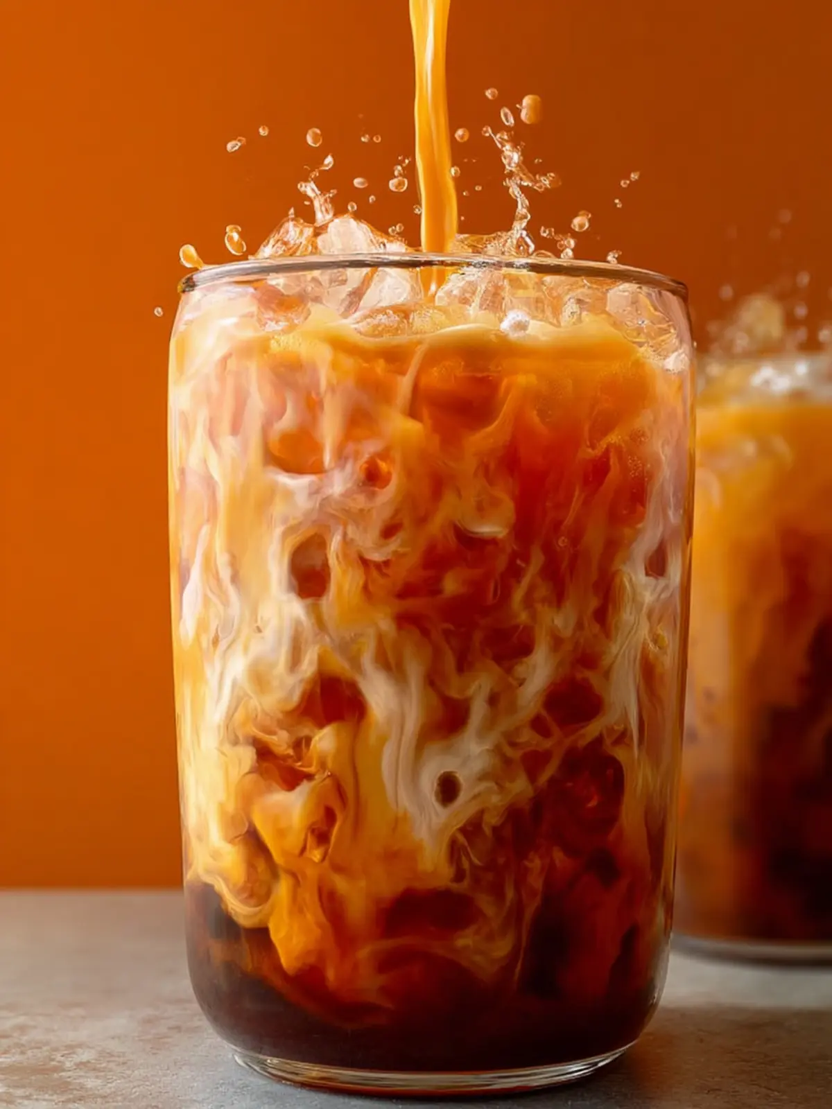 8. The white milk will slowly bloom and swirl down into the dark orange tea, creating a beautiful marbled effect. Give it a gentle swirl with a straw right before you take your first sip.