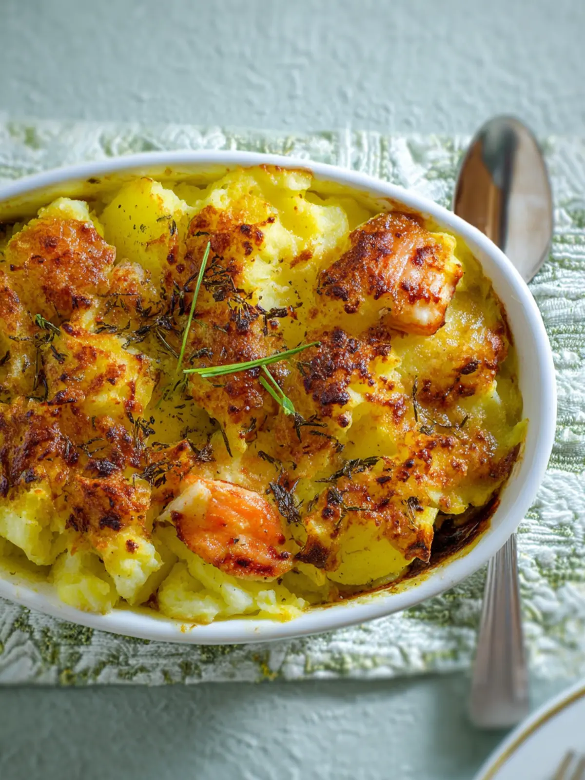 A delicious and comforting fish pie featuring a creamy filling and a golden, crunchy potato topping.